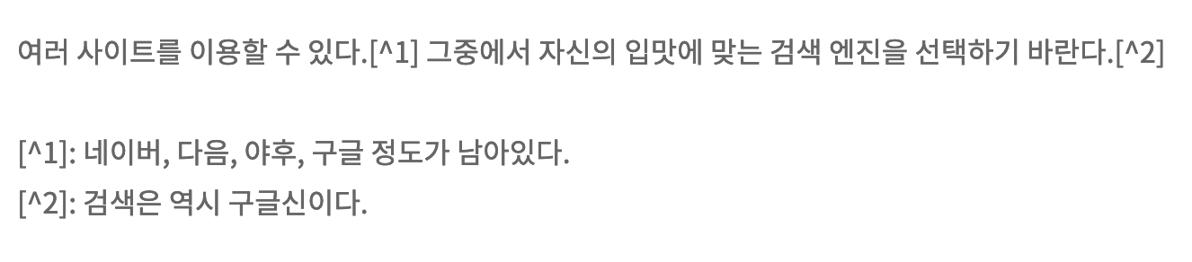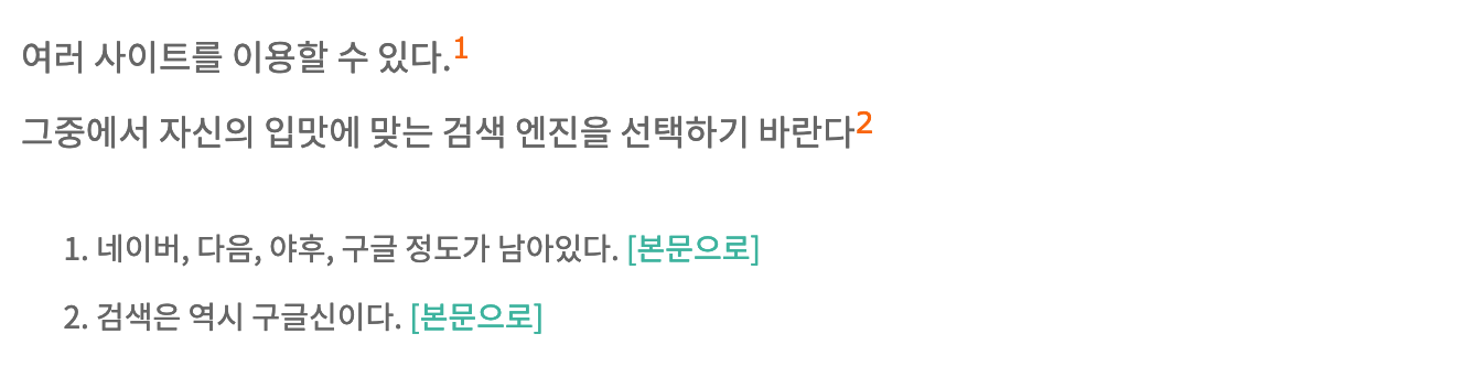 스크린샷에서 보는 바와 같이 이 방식으로는 각주가 제대로 처리되지 않는다. 각주는 아래의 방법을 사용해야 적절하게 처리됩니다.
