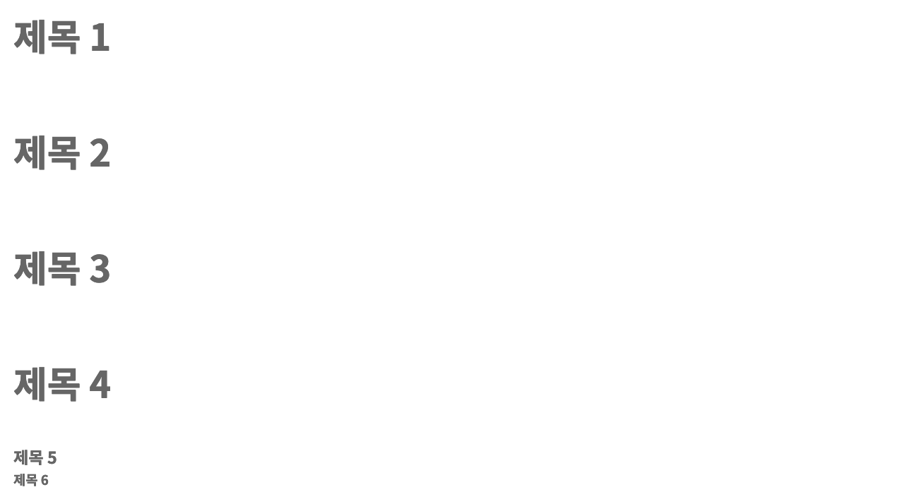 6 단계는 본문 글자의 크기보다 작았습니다. 현재 설정에서 오직 한 형태의 제목 형태(1~4 단계 동일)만 쓸 수 있다는 걸 확인할 수 있었습니다.