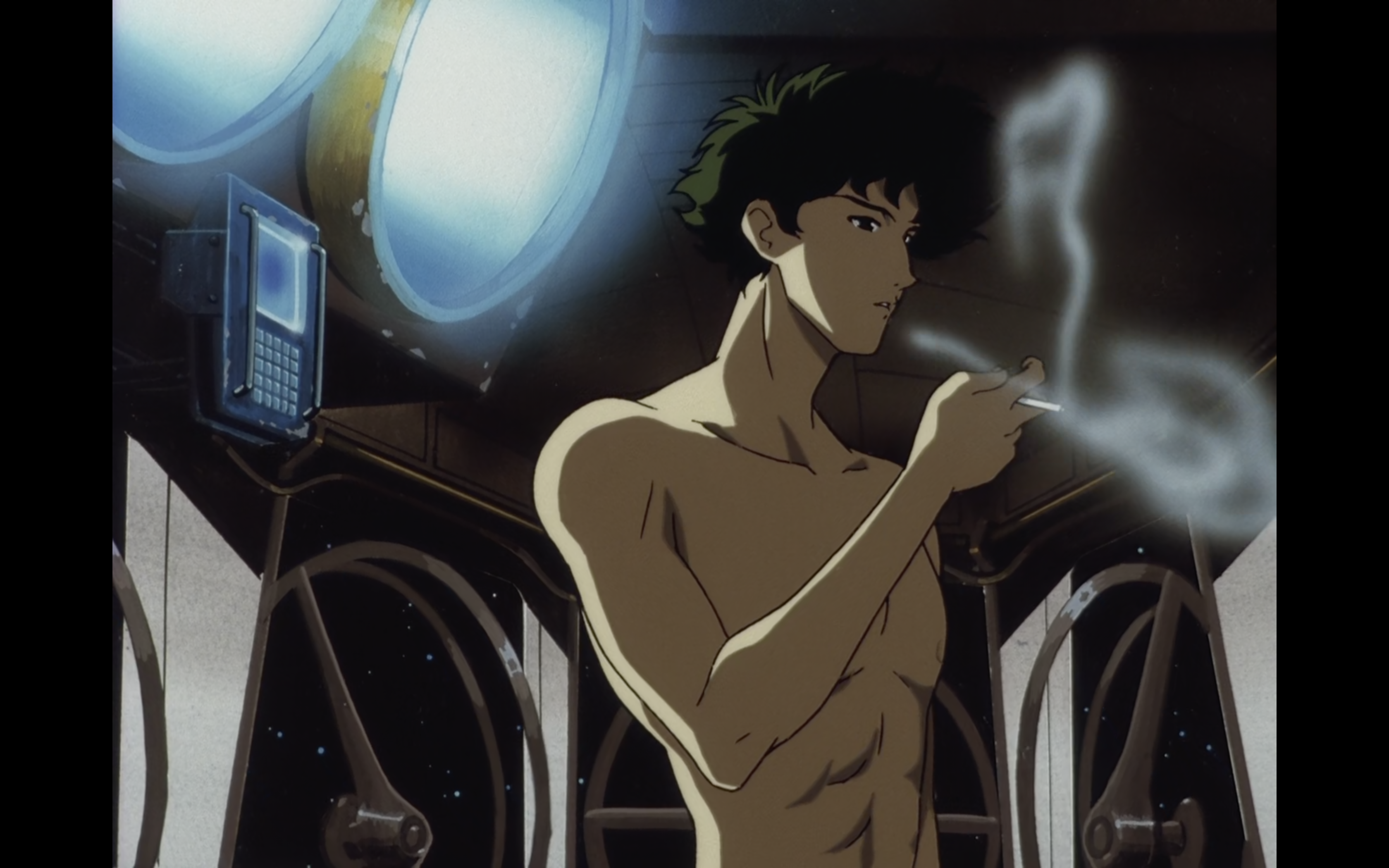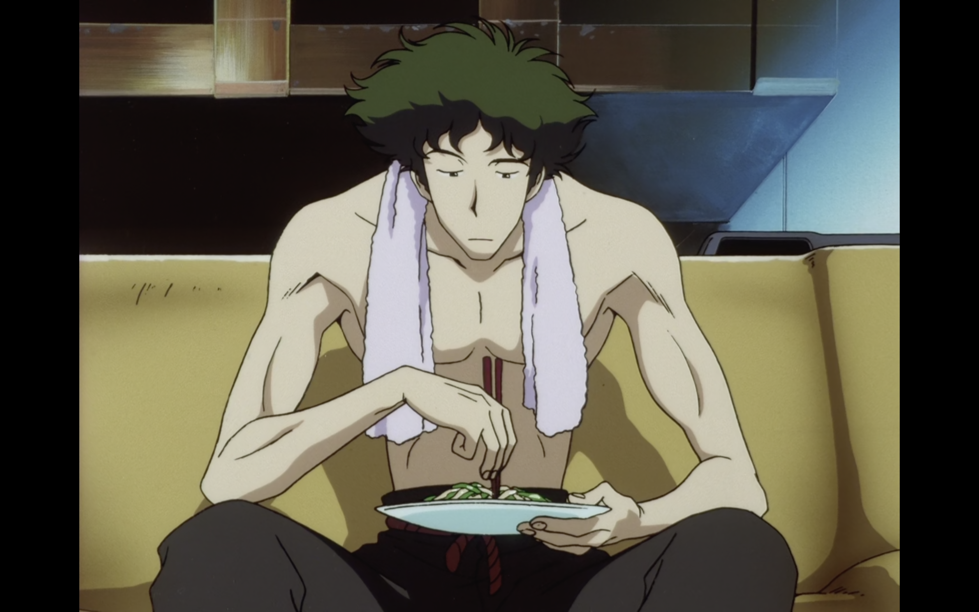 멋진 오프닝이 끝나자 마자 등장인물 스파이크 스피겔(Spike Spiegel)의 상체 탈의 씬을 보게 된다. 중국 무슬, 일본 애니이니 공수도이려나 여튼 어둠 속에서 스파이크가 권술을 수련하는 장면이 나온다. 왼발과 왼손이 함께 나온 것 같지만 ... 기분 탓일 뿐 좀 멋지다.
