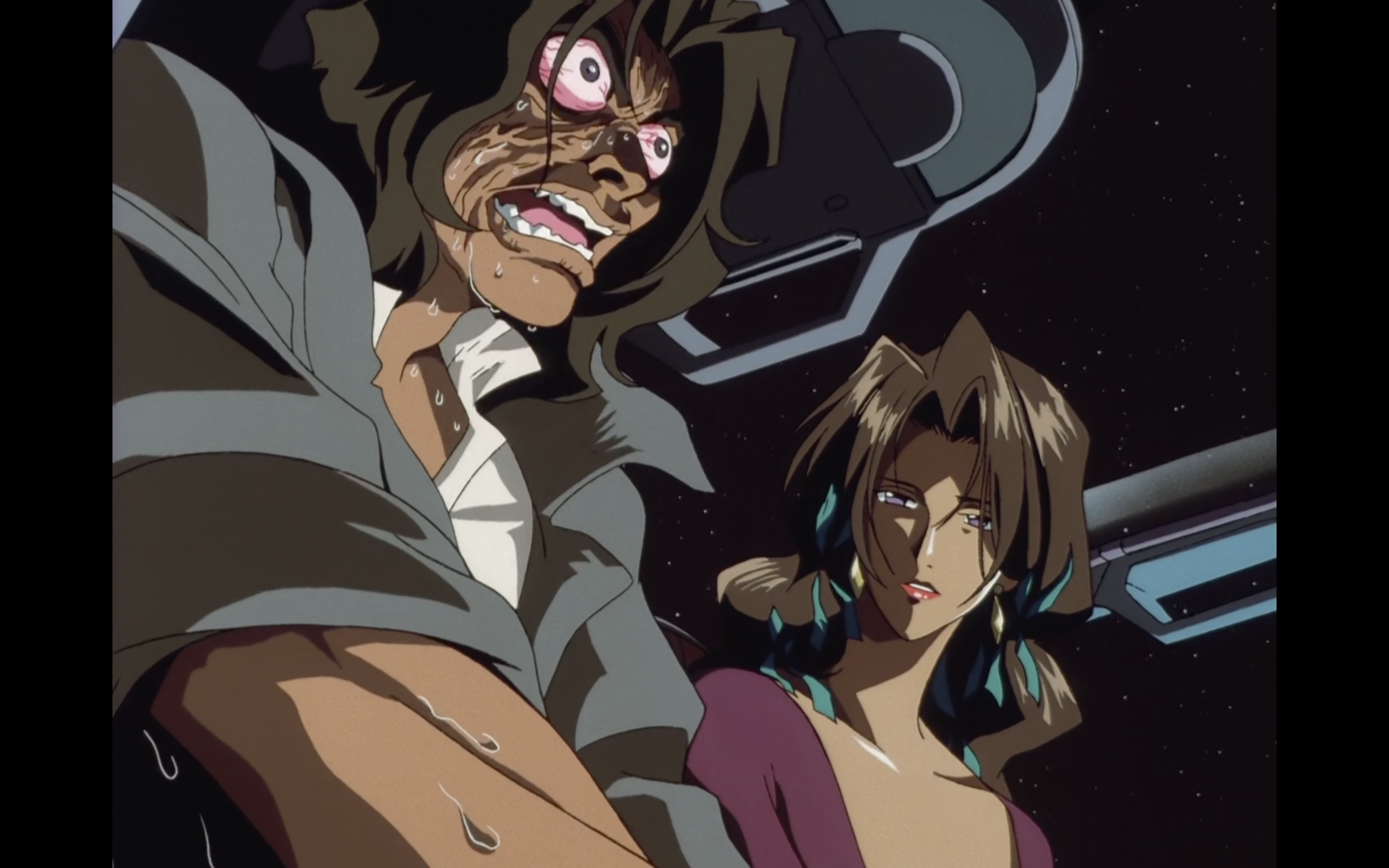 이 둘은 비밥호를 타고 함께 현상금 사냥꾼을 업으로 하는 동료입니다. #1의 사냥감은 아시모프 소렌산(Asimov Solensan): 250만 우롱입니다. 이름만 봐서 러시아계인 듯합니다만 위성차 공간 벨트를 살아가는 작품 속에서는 별 의미가 없겠지요. 조직의 상품인 블러디 아이(Bloody Eye, 안구형 마약 Red Eye의 최상품)를 빼돌려 애인(운반책)과 함께 화성으로 도주 중입니다. 도주 중 잦은 블러디 아이 사용으로 이미 심신은 만신창이가 된 상태로 당장 부서져도 이상하지 않은 상태입니다.