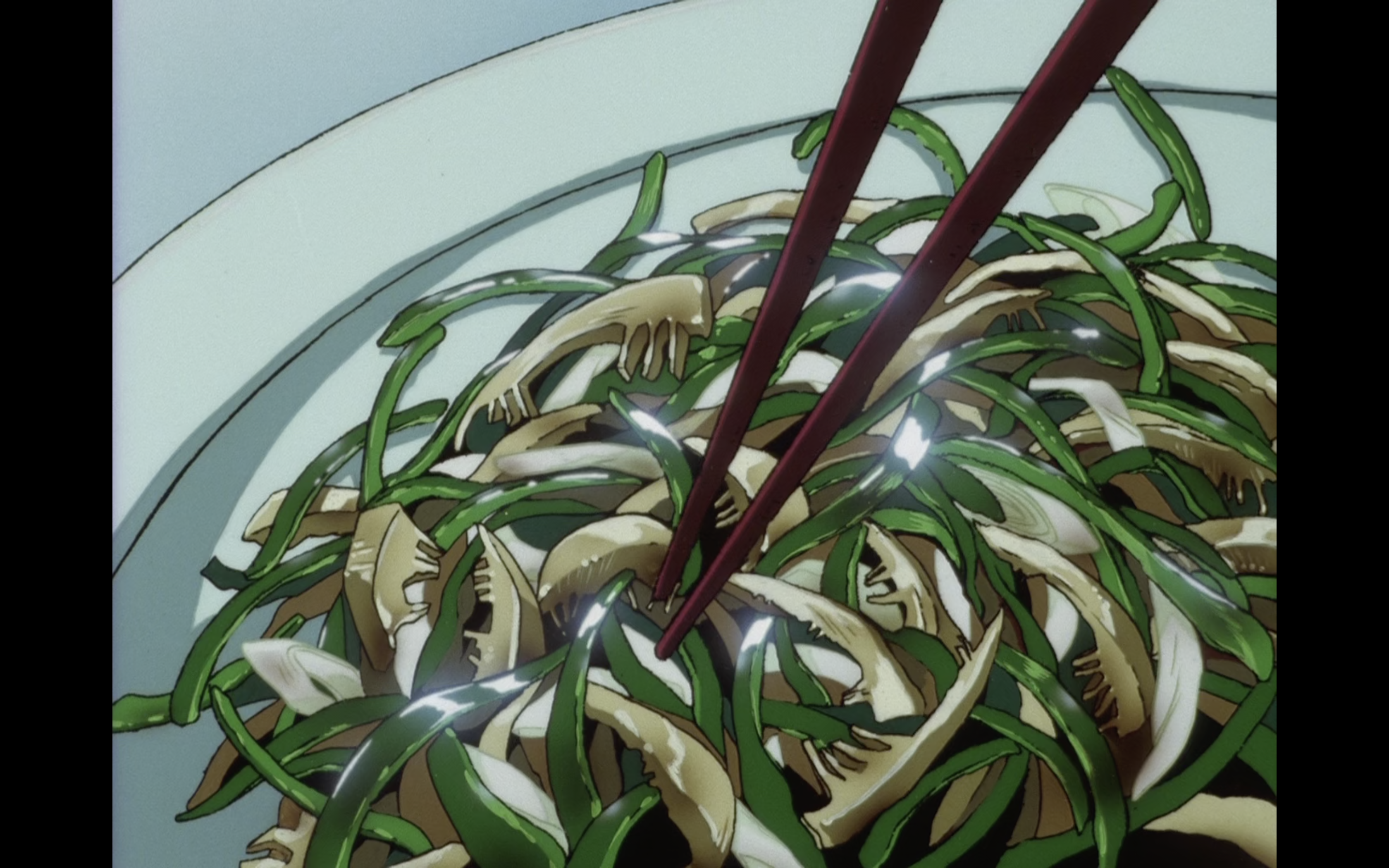 고기가 빠진 친져로스를 받아든 스파이크의 혼마저 털린 표정을 지으며 젓가락으로 기름에 볶긴 풀밭을 헤치고 있네요. 상당히 귀엽습니다. 아직 20대라서 그런 게 분명합니다. 스파이크의 투정에 제트는 네가 사고 친 덕에 거지꼴을 못 면하고 있을 땐 이런 풀떼기가 친져 로스가 될 수 있다고 한방 먹입니다.