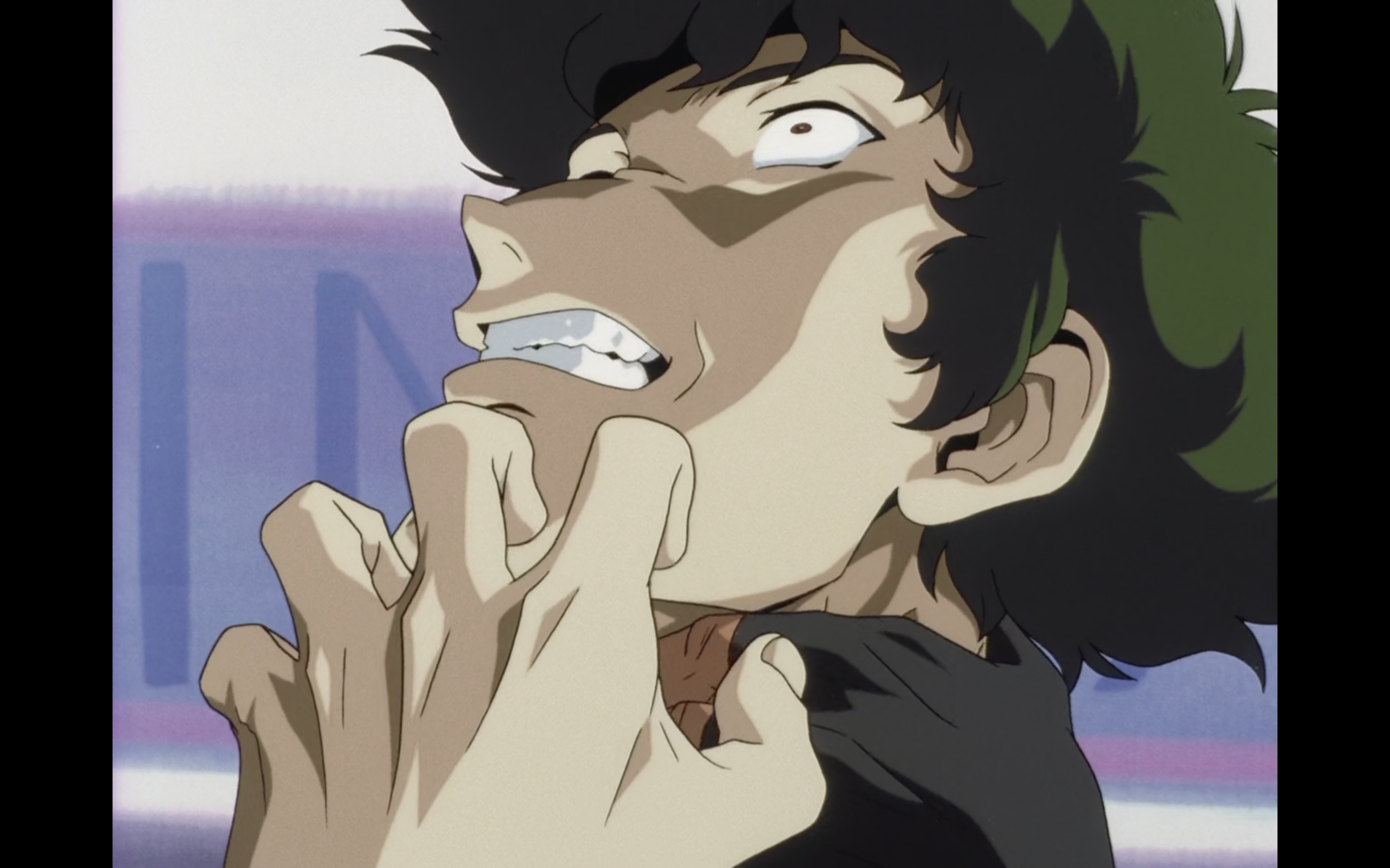 화성이란 공간은 스파이크에게 다른 의미를 가지고 있었기 때문입니다. 이와 관련한 스토리는 그립고도 슬픈 이름인 비셔스, 줄리아가 나오면 밝혀지게 됩니다. 우선은 스파이크의 슬픈 예감을 이 스틸샷에서 확인할 수 있지요. 측면이 아니라 정면 표정이었다면, 스파이크의 오드 아이가 도드라지면서 오묘한 표정을 더 잘 드러낼 수 있지 않았을까 하는 아쉬움이 있습니다.
