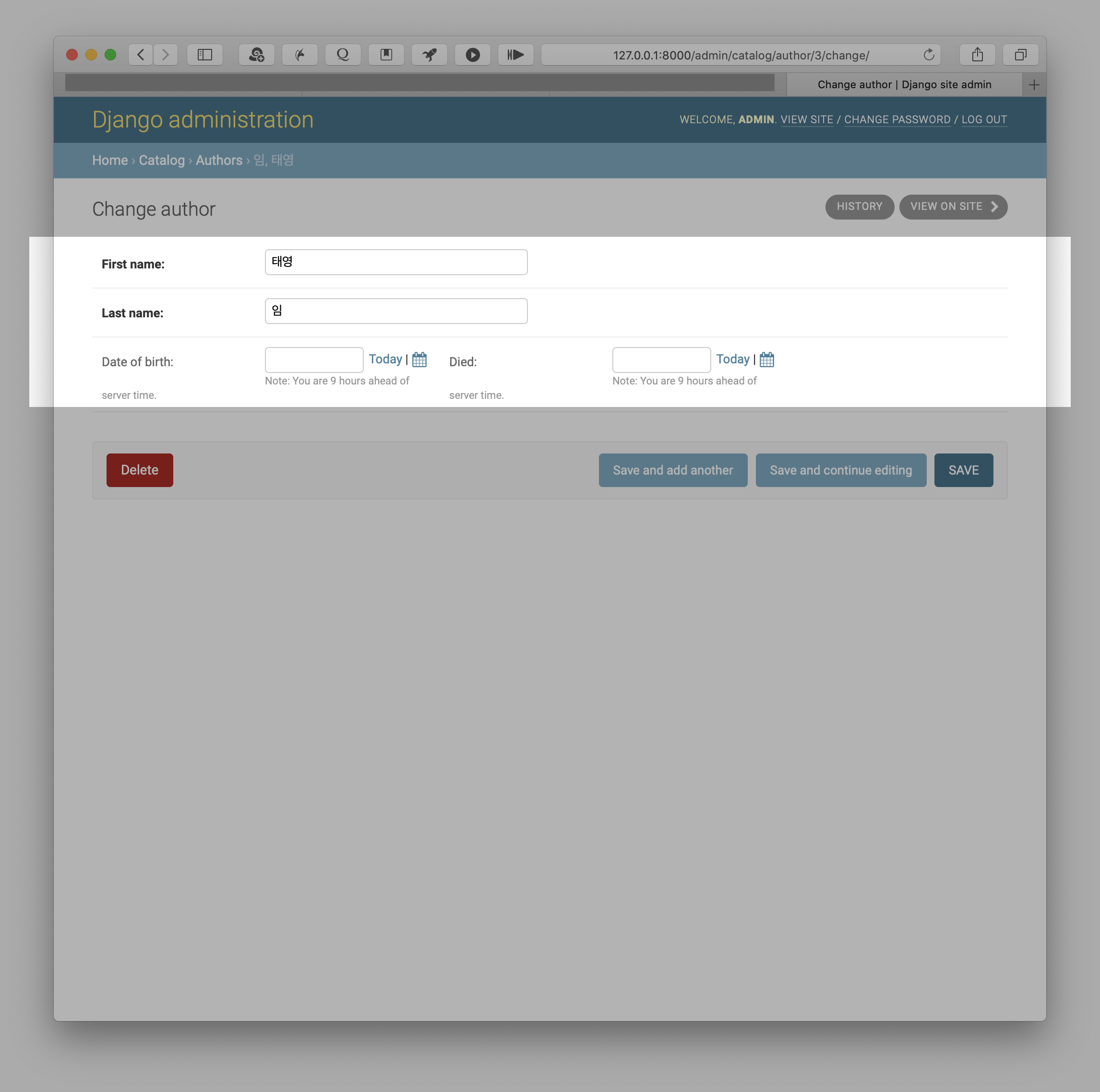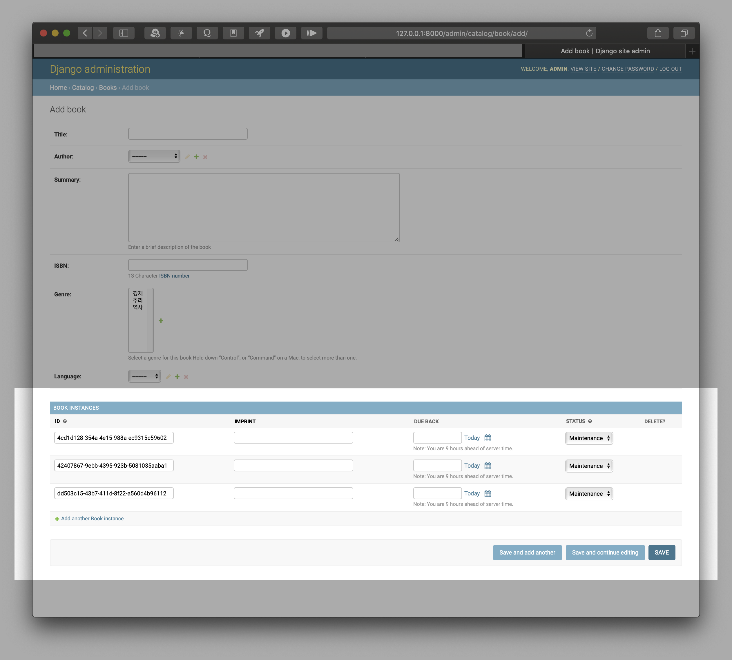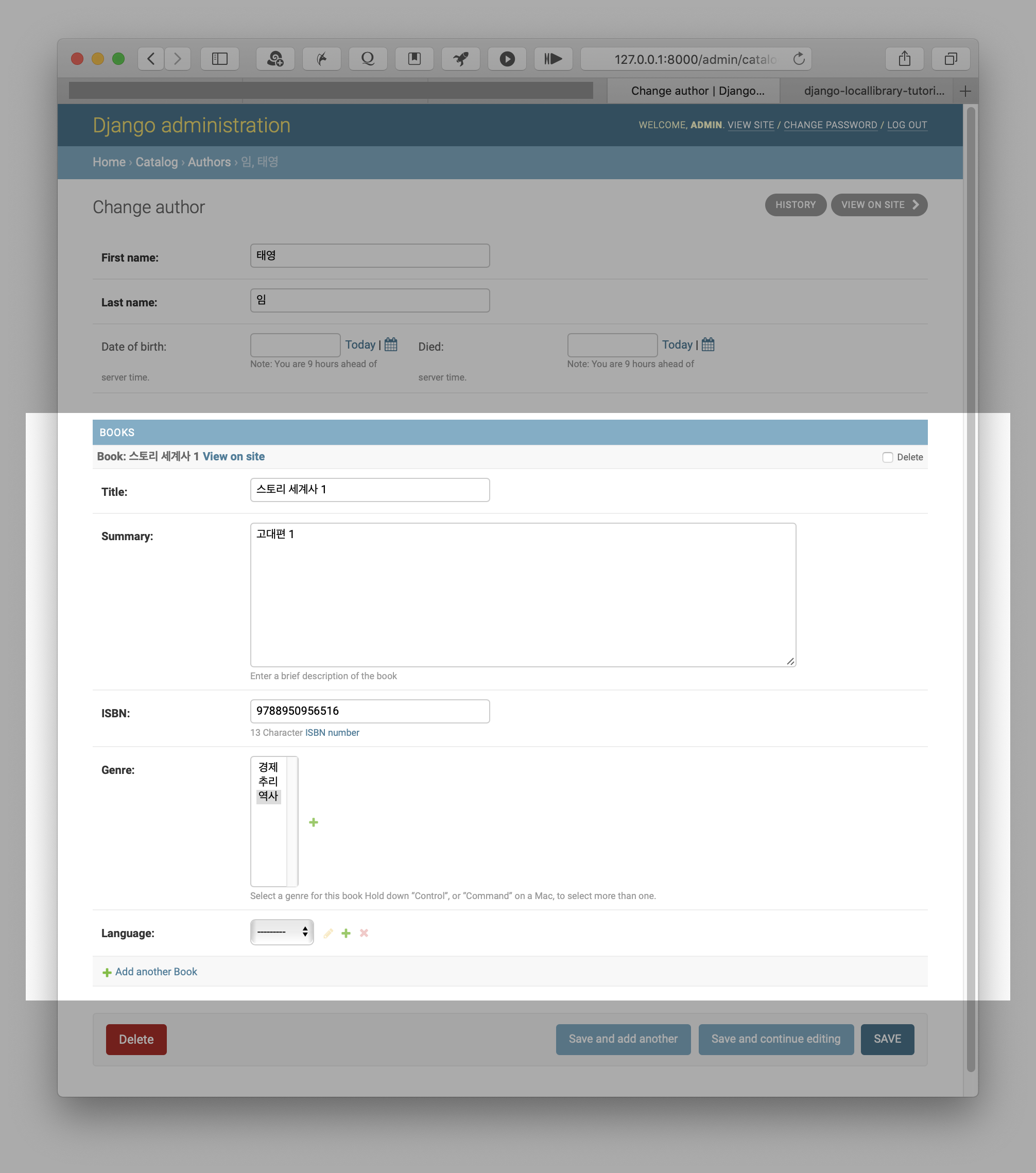 Book/BookInstance과 다른 점은 BookInline 클래스를 정의할 때 StackedInline을 사용한 것과 extra 속성을 추가한 점이다. StackedInline은 목록을 세로로 배치하도록 하며, extra 속성은 내용이 빈 항목을 여유분으로 몇 개 더 보여줄지를 지정하는 속성이다. Book/BookInstance에서는 따로 지정하지 않아 기본값(?)인 3개 생성되었지만 여기에서는 0으로 지정하였다.