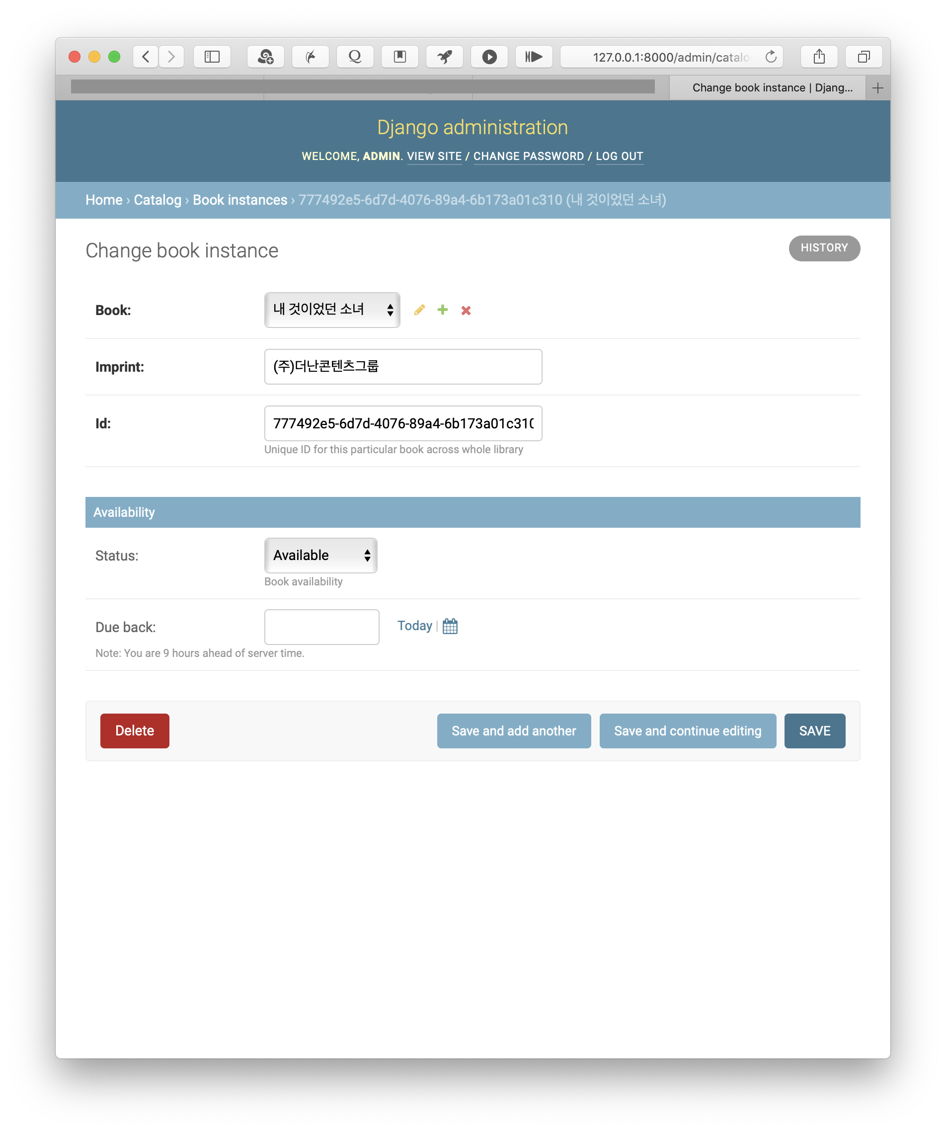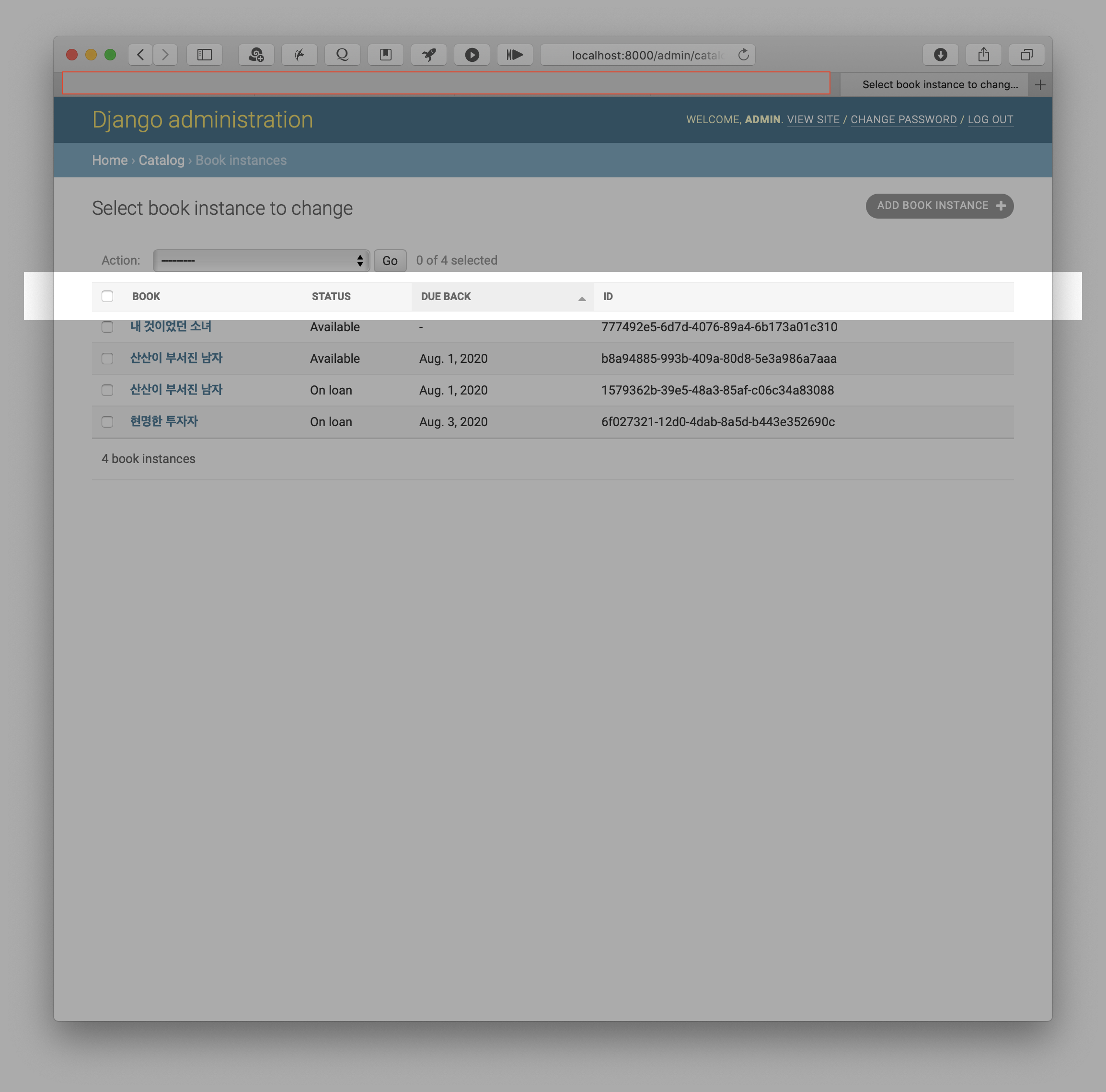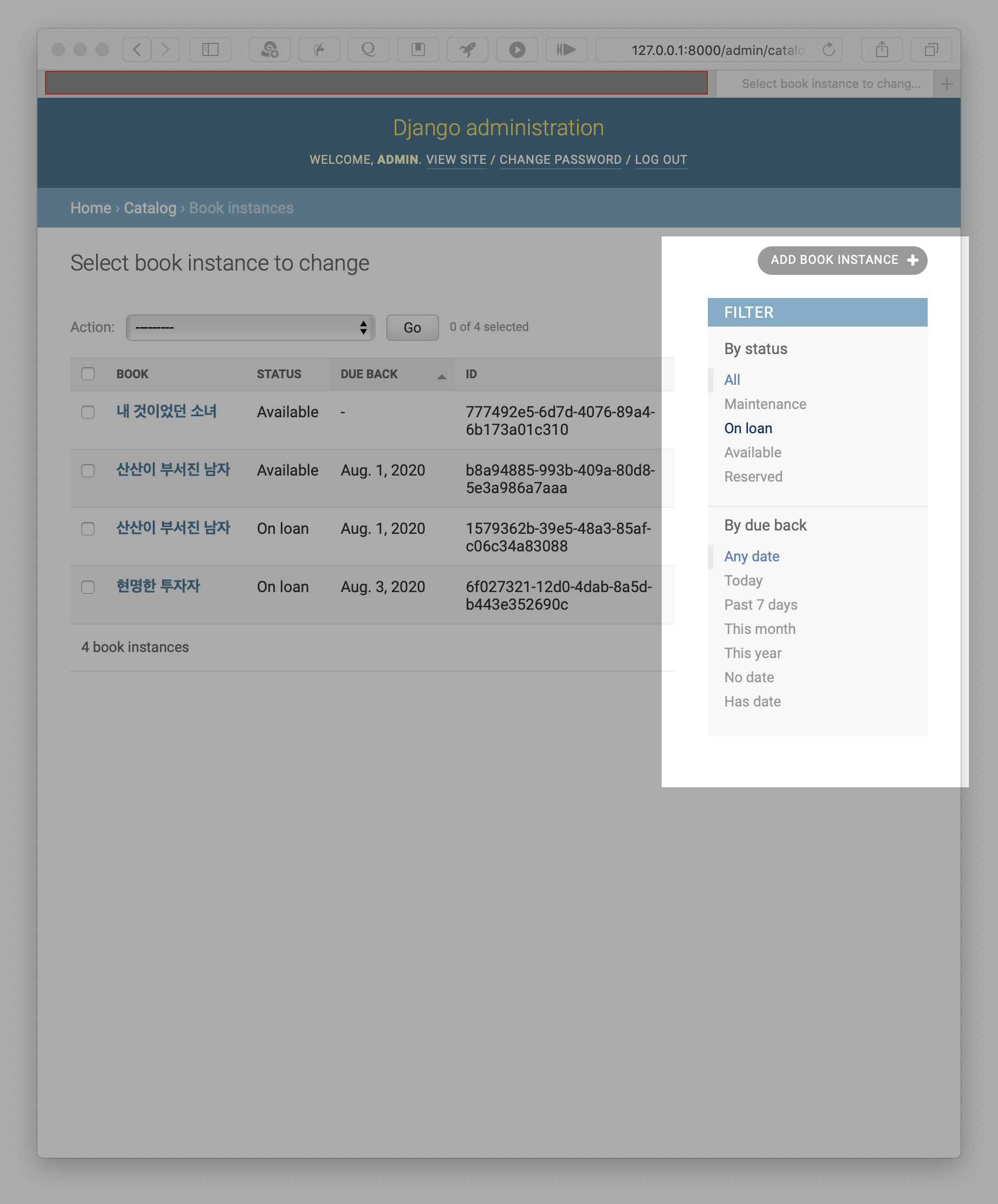 이제 BookInstance 페이지를 변경하기 위해 아래와 같이 이전 파일(admin.py)을 아래와 같이 편집하자. 수정 전 페이지는 아래와 같다.