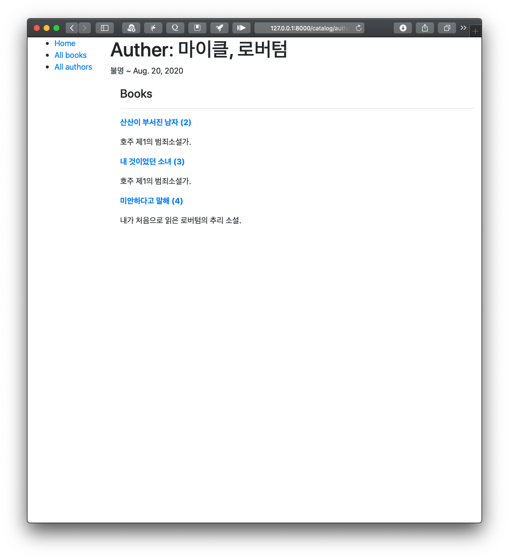 2020/08/17 - [Django] - localLibrary 저자 & 책 페이지 만들기: 제너릭 뷰와 상세 뷰