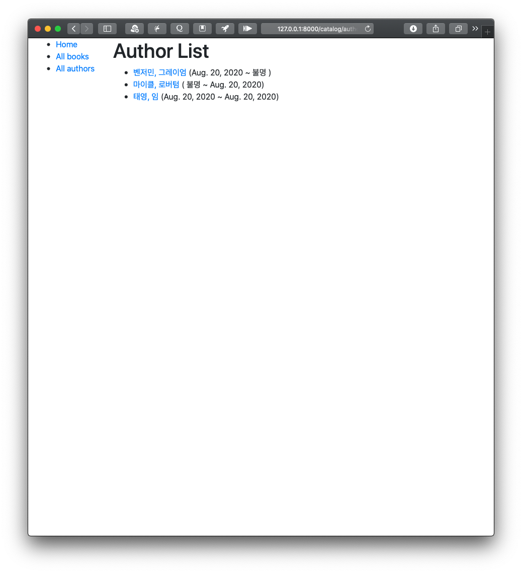 여기까지 마치면 아래와 같은 저자 페이지와 저자 상세 페이지가 뜨는 것을 확인할 수 있다.