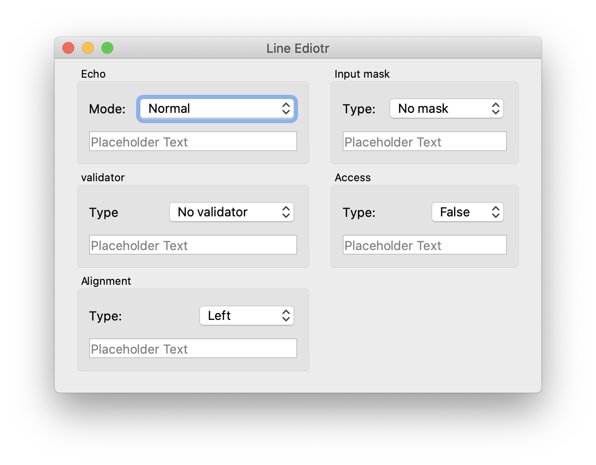 여기에 총 다섯 묶음의 위젯을 왼쪽에 3 묶음(echo mode, validator, alignment), 오른쪽에 2 묶음(input mask, read-only)으로 배치한다. 각 묶음은 묶음의 라벨과 그 아래에 QLabel, QComboBox, QLineEdit를 동일하게 배치할 것이다. 전체적인 배치는 QGredLayout을 이용할 것이다.