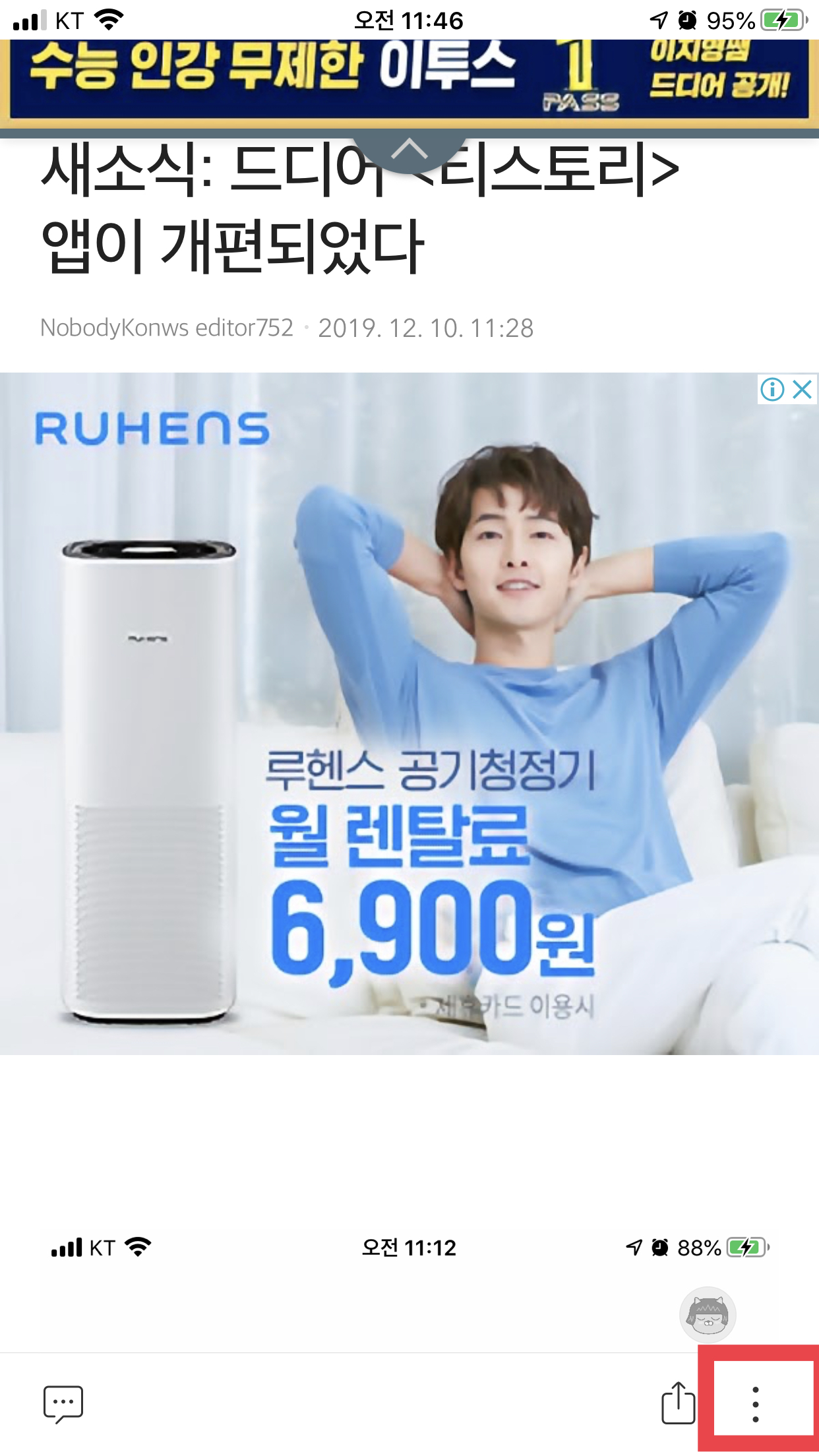 물론 복수의 사진도 잘 업로드되는 모습을 확인할 수 있다. 일단 포스팅한 글을 편집하기 위해서는 앱에서 해당 글을 연 다음 화면 오른쪽 하단의 세로로 나열된 점 세 개 모양의 아이콘(일반적으로 설정 아이콘 모양)을 선택한다.