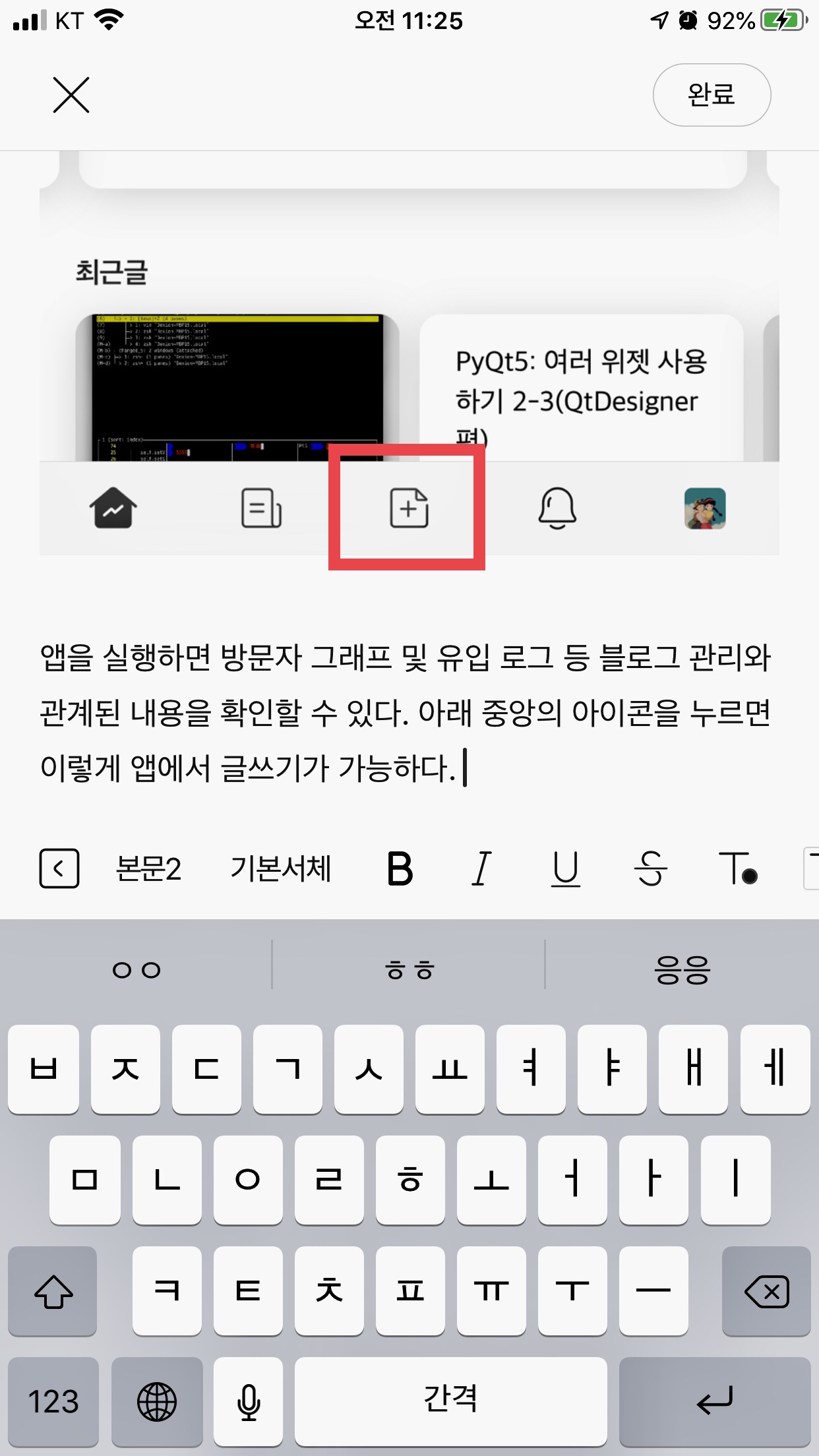 앱을 실행하면 방문자 그래프 및 유입 로그 등 블로그 관리와 관계된 내용을 확인할 수 있다. 하단의 아이콘을 차례대로 설명하면 첫 번째는 <관리 홈>, 두 번째는 내가 구독하고 있는 <피드>, 세 번째는 <글쓰기>, 네 번째는 <알림>, 마지막은 <내 블로그>가 되겠다. 아래 중앙의 아이콘을 누르면 이렇게 앱에서 글쓰기가 가능하다.