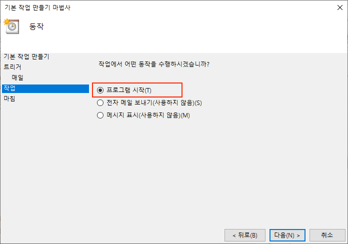 실제 어떤 동작을 할지 선택하는 것이다. 앞에서 녹음을 하기 위해 만들어 놓은 배치 파일이 있고 해당 시간에 이 배치 파일을 실행할 것이기 때문에 프로그램 시작을 선택한다. 다음을 눌러 다음 단계로 넘어간다.