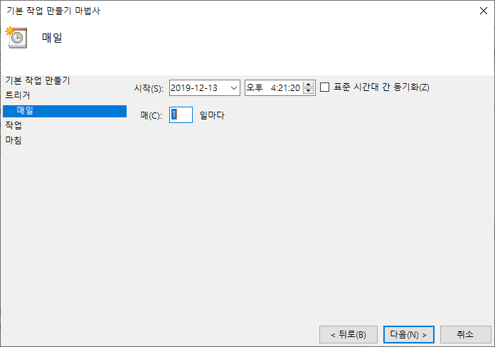 앞에 선택한 주기에 따라 세부 일정을 지정하는 단계다. 우선은 날짜와 시각을 지정하고 일 간격을 선택할 수 있다. 앞에서 매주를 선택했다면 이 화면에서 특정 요일을 지정할 수 있다. 다음을 눌러 다음 단계인 작업으로 넘어간다.